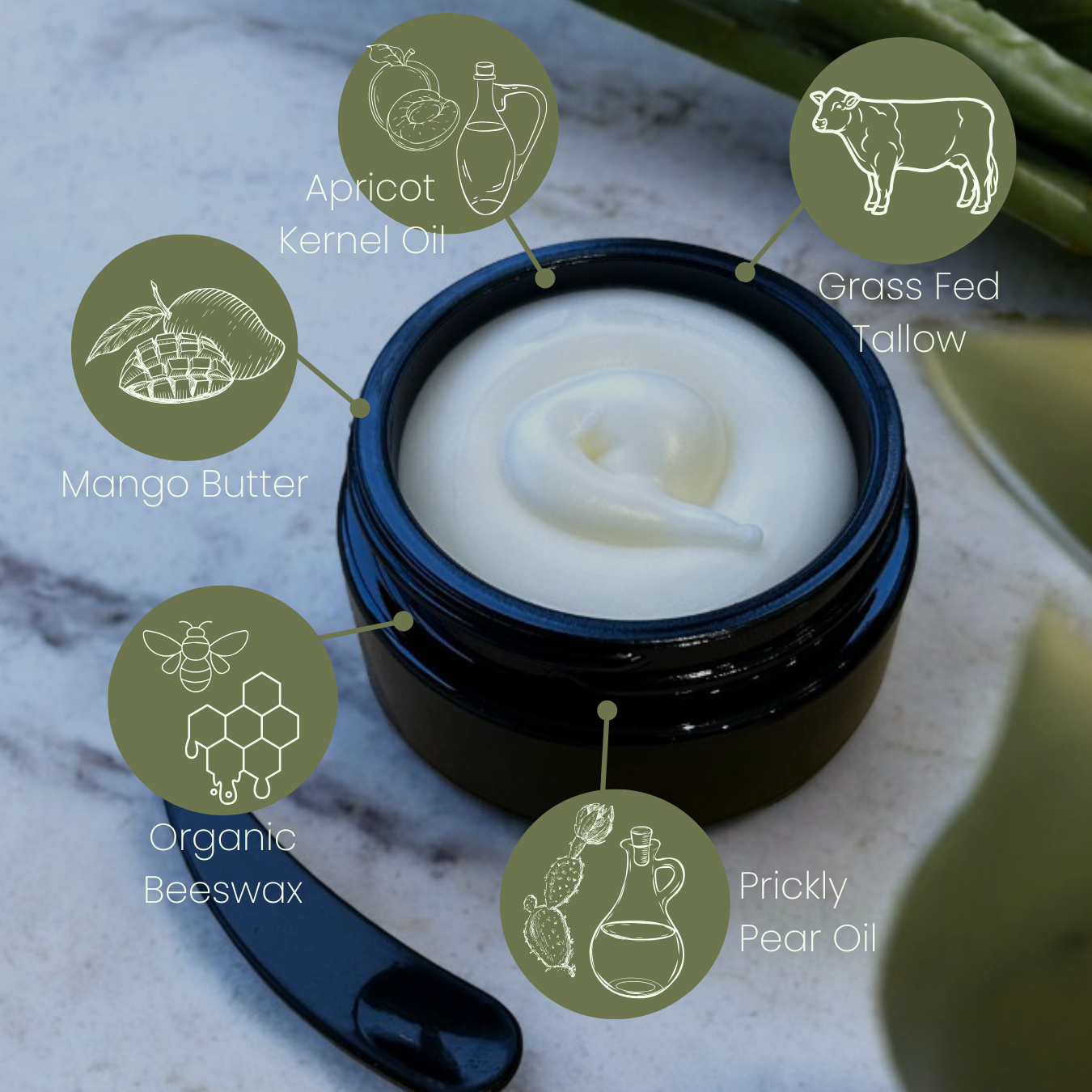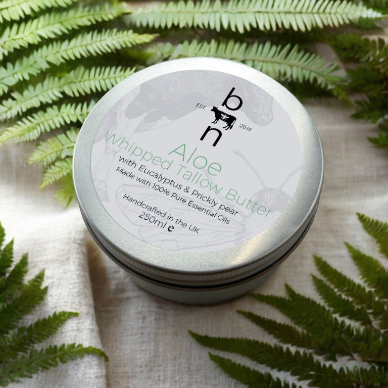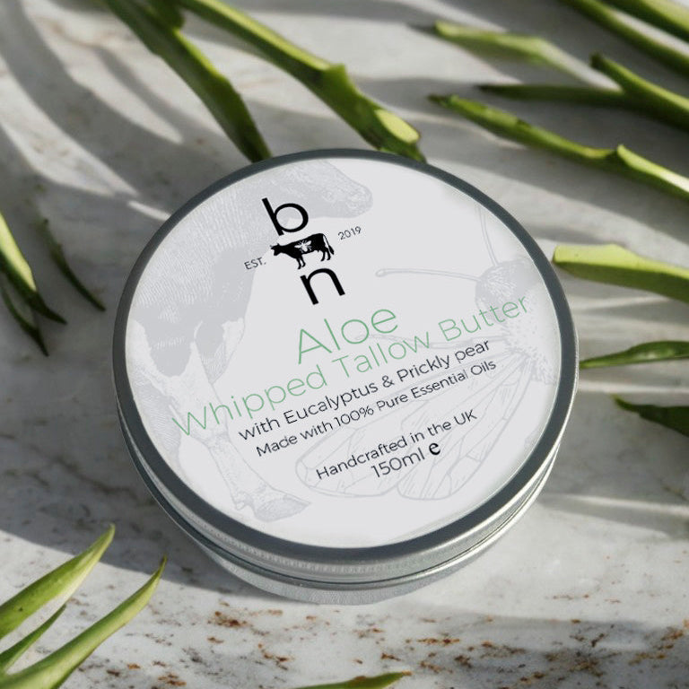 Our Aloe Whipped Tallow Butter is a luxurious, deeply nourishing moisturizer designed to hydrate, soothe, and rejuvenate your skin. With a rich blend of grass-fed tallow and powerful botanicals, this cream provides intense hydration, locks in moisture, and forms a protective barrier to promote healthy, glowing skin. The essential fatty acids and vitamins found in tallow nourish and restore your skin's youthful radiance.